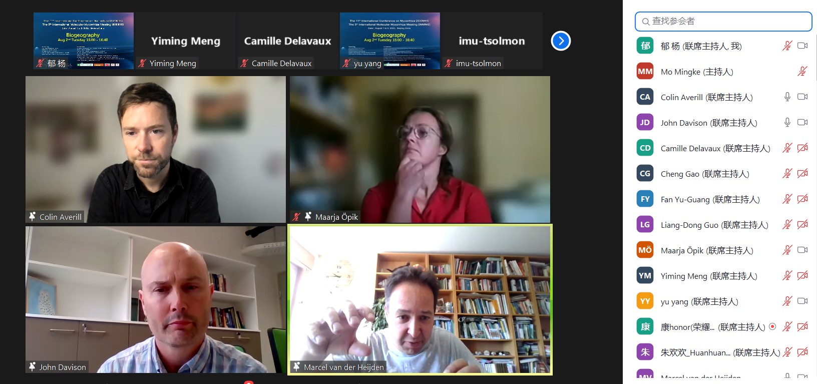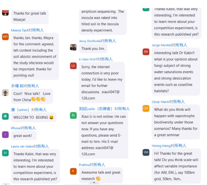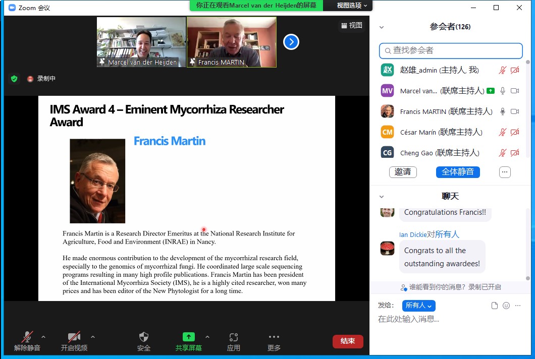 共有来自34个国家和地区的700余位菌根领域研究学者报名参加,创历史参会人数新高。中国菌物学会理事长、中科院微生物研究所郭良栋研究员致开幕辞,IMS现任主席瑞士苏黎世大学Marcel van der Heijden教授主持IMS理事工作会议,总结大会的成功举办。在为期5天21个场次的紧张在线会议中,全球菌根研究学者们对当前研究领域的热点问题进行了广泛交流与讨论。视频会议各环节时间紧凑,气氛轻松和热烈,是一次成功的菌根学术盛宴!会后,组委会还将在会议官网开辟新栏目,进行为期一周的展示精彩报告回看。
