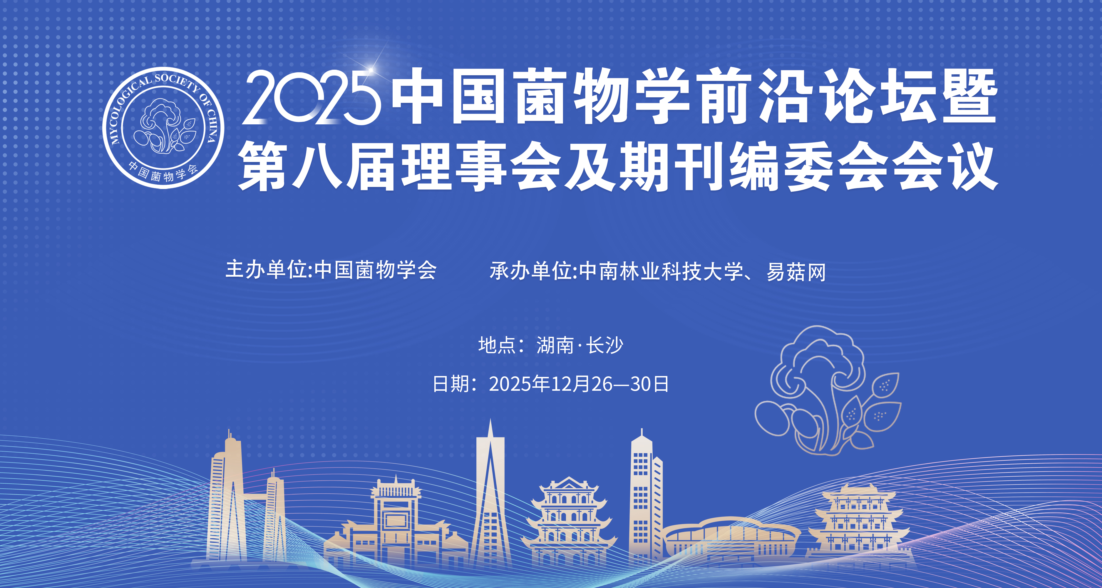 为总结2025年菌物学领域研究进展与成果,促进菌物学科发展与菌物产业进步,经中国菌物学会研究决定,于2025年12月26-30日在湖南长沙召开2025年中国菌物学前沿论坛,并在同期召开中国菌物学会第八届理事会会议及《菌物学报》编委会议。欢迎各位菌物学界同仁、学会会员积极参加会议,有关安排通知如下: